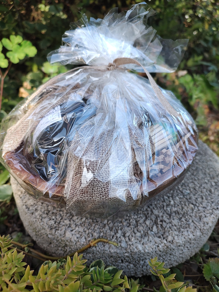 This beautiful acacia bowl contains a beeswax candle, long match sticks, honey Suds bar soap, and honey sticks.