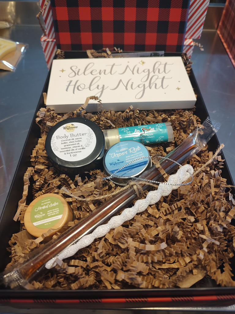 Body Butter, Herbal Salve, Vapor Rub, Lip Balm, Honey Sticks, wooden decorative silent night sign.