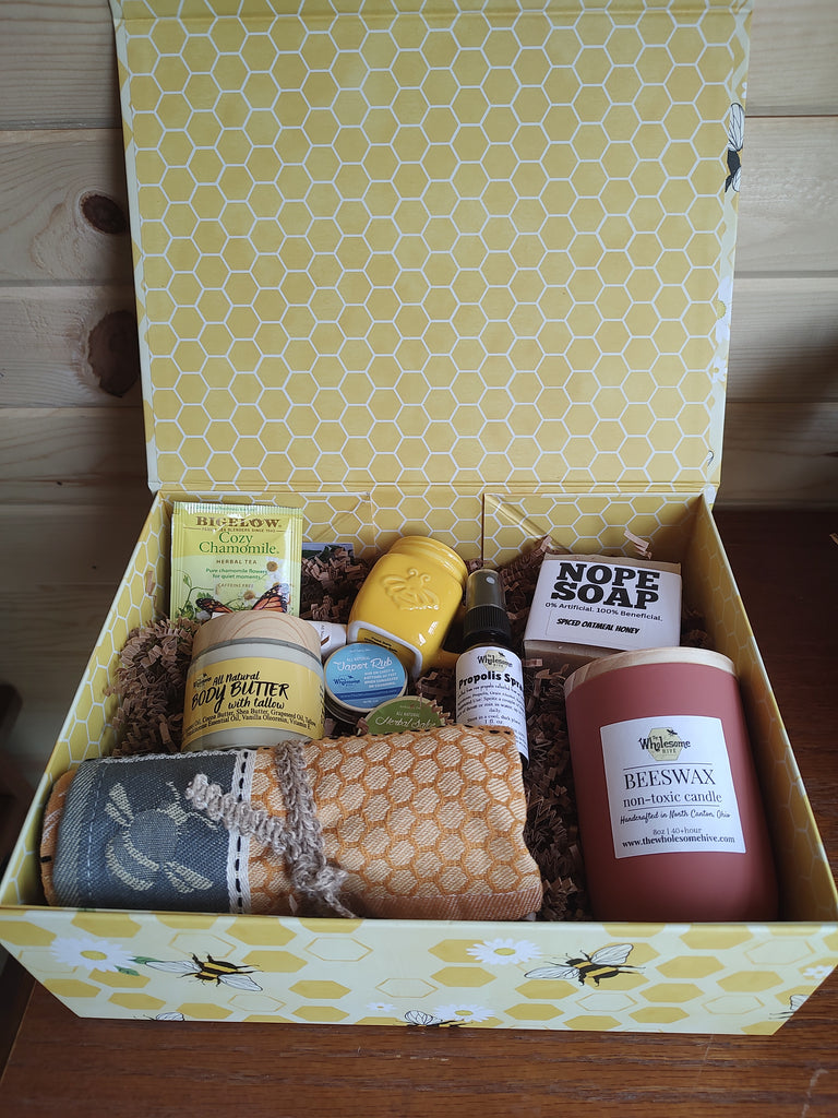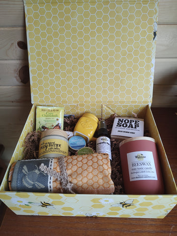Nope soap, beeswax candle, propolis spray, vapor rub, herbal salve, lip butter, body butter, tea towel, herbal tea, and mini ceramic bee mug!