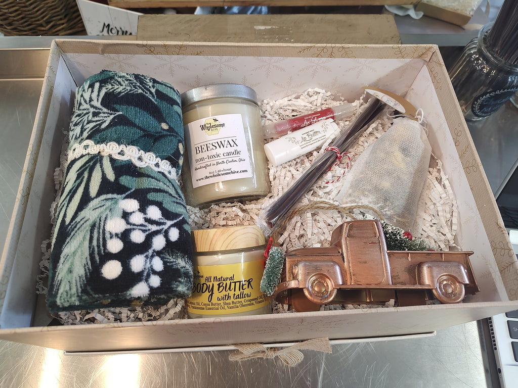Beeswax candle, herbal bath tea bag, hand towel, body butter with tallow, lip luster, lip butter, honey sticks, tree ornament