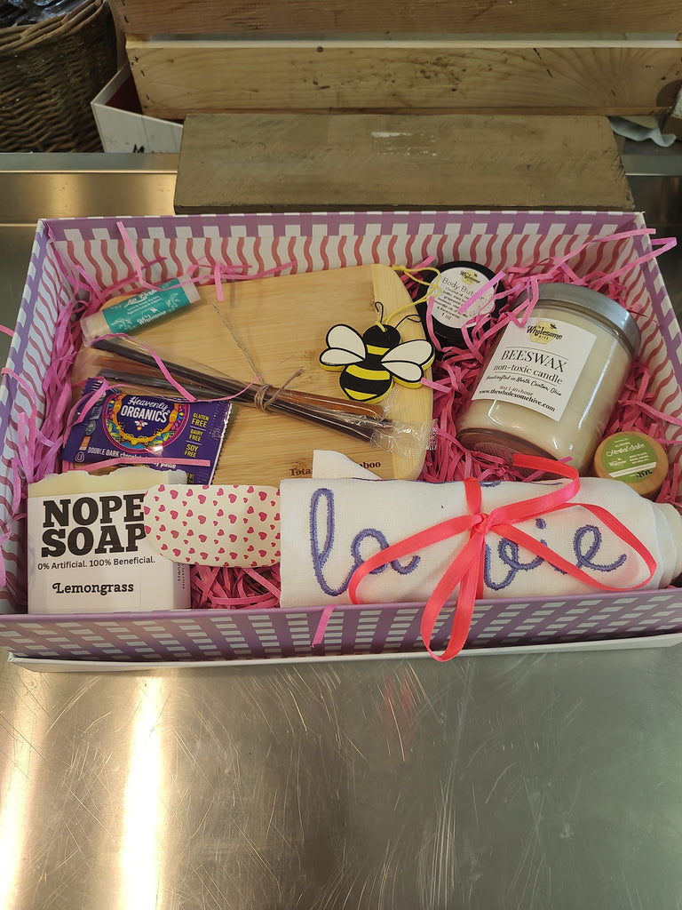 Nope soap, small cutting board, lip balm, tea towel, spatula, body butter, herbal salve, beeswax candle, chocolate covered honey