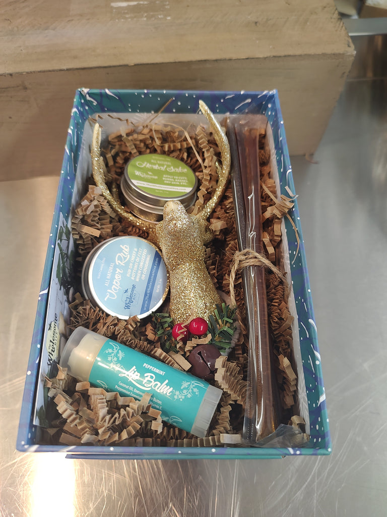 Herbal Salve, vapor Rub, lip balm, honey sticks, reindeer ornament